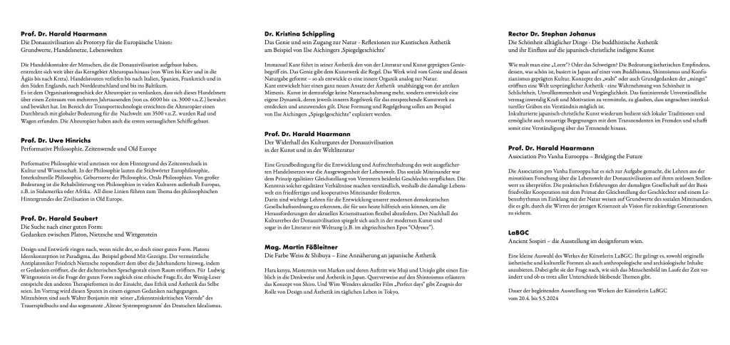 Ein spannender wissenschaftlich-künstlerischer Kongress „Die Lebenswelt der vorantiken Donauregion und ihre zeitlos gültigen Werte“ findet im Designforum in Wien am Samstag, den 20. April 2024 statt. Ich werde einen Vortrag zum Thema „Das Genie und sein Zugang zur Natur – Reflexionen zur Kantischen Ästhetik am Beispiel von Ilse Aichingers ‚Spiegelgeschichte‘“ halten. Anmeldungen bitte an die Mailadresse von Prof. Haarmann: harald.haarmann@pp.inet.fi Es sind alle herzlich eingeladen, auch sind keine Vorkenntnisse nötig. Der Eintritt ist frei.