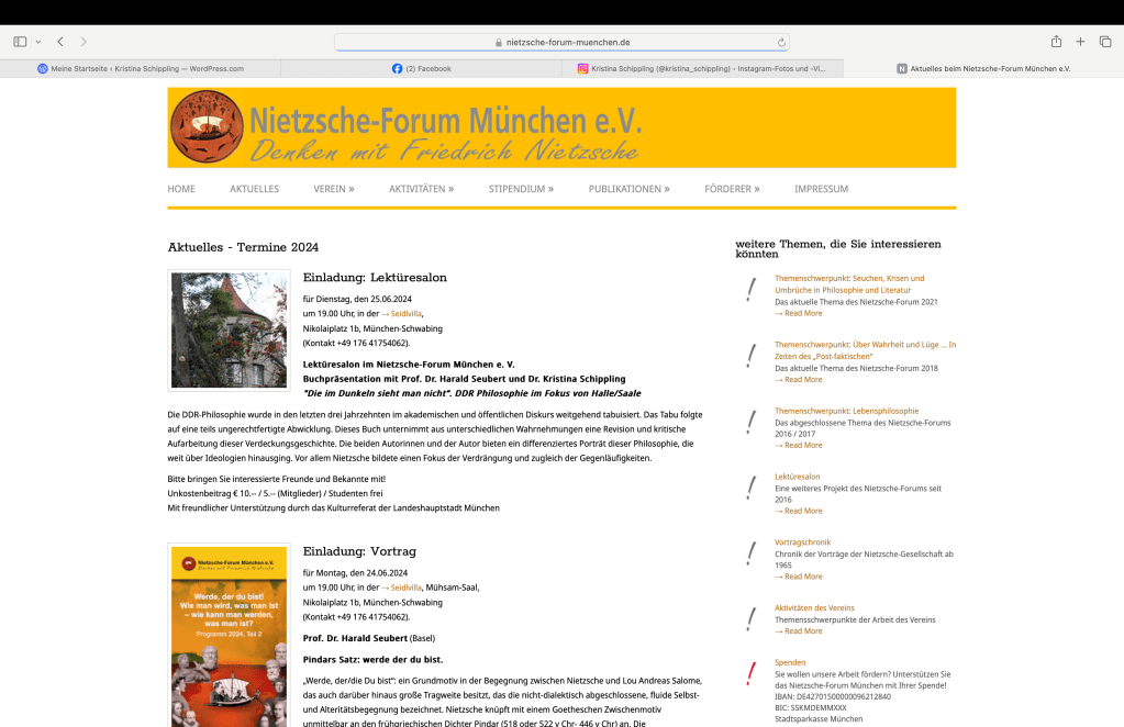 Die erste Lesung zu unserem Buch „Die im Dunkeln sieht man nicht – Die DDR-Philosophie im Fokus von Halle/Saale“, das ich gemeinsam mit meiner Mutter Dr. Ursula Schippling und dem Basler Philosophie Professor Harald Seubert gerade noch schreibe, findet im Nietzsche-Forum in München am Dienstag, den 25.06.2024 in der Seidlvilla um 19.00 Uhr statt. Ein ganz großes Dankeschön an Frau Dr. Wachendorff für die Einladung! Unkostenbeitrag: 10 €, 5 €, für Studenten frei.