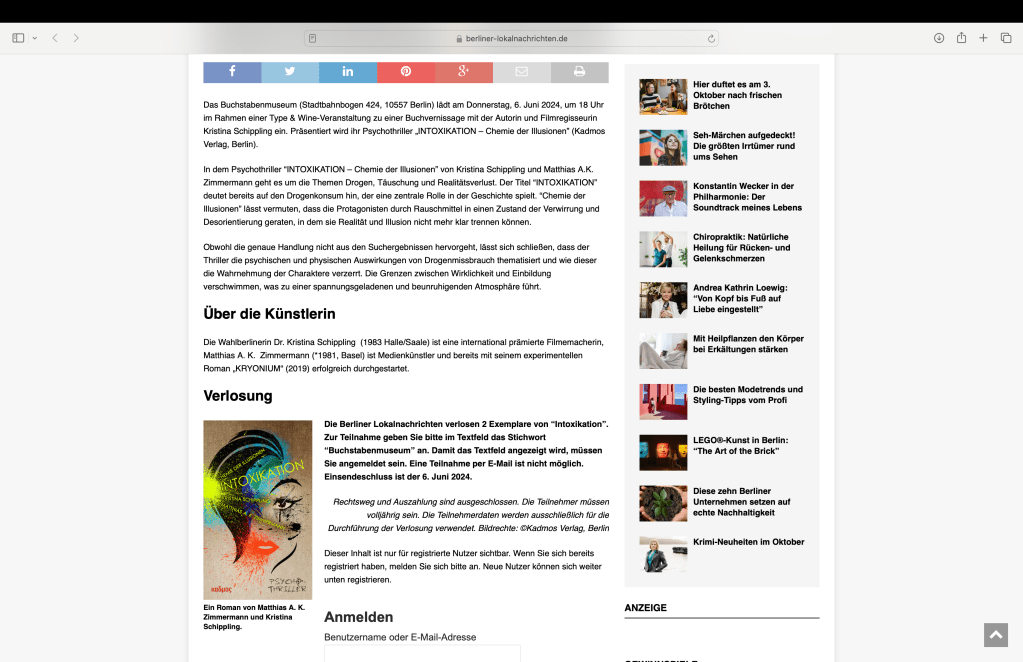 Unser Psychothriller „Intoxikation. Chemie der Illusionen“ hat schon eine beachtliche Reise hinter sich. Mehrere Lesungen im Buchstabenmuseum, in Bibliotheken haben stattgefunden, wir sind mehrfach rezensiert worden. Für diese wundervolle Resonanz möchte ich mich herzlich bei unserem Publikum, meinem Co-Autor Matthias A. K. Zimmermann und unserem Kulturverlag Kadmos bedanken! Anbei mehrere Links zu Rezensionen: