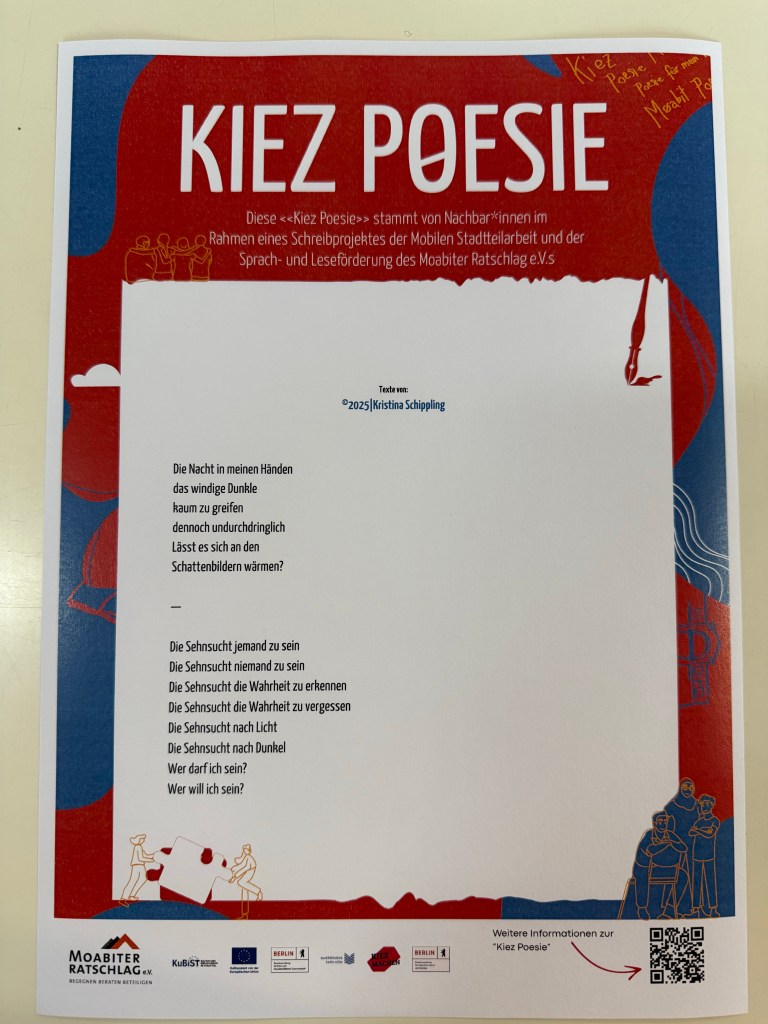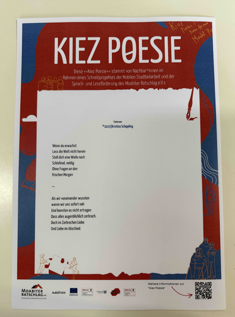 Es hat mich ganz besonders gefreut, zum dritten Mal bei der Kiez-Poesie dabei sein zu dürfen und in Moabit (mein Berliner Kiez) mit vier meiner neuesten Gedichte auszuhängen. Die Gedichte hängen im Schaufenster der Ludwigs-Apotheke, Essener Straße 16 und bei Liedtke – Die Wohnmacher, Oldenburger Straße 11 in Moabit aus. Ich finde das Konzept und Projekt einfach wundervoll, die lokalen Geschäfte und Cafés mit den Schreibenden der Stadt zu verbinden und gemeinsam Kunst zu kreieren. Danke dafür vor allem an Susann und Jule und an die Kiez-Poesie! Euch allen wünsche ich viel Freude beim sommerlichen Spaziergang durch Moabit und beim Gedichte lesen!