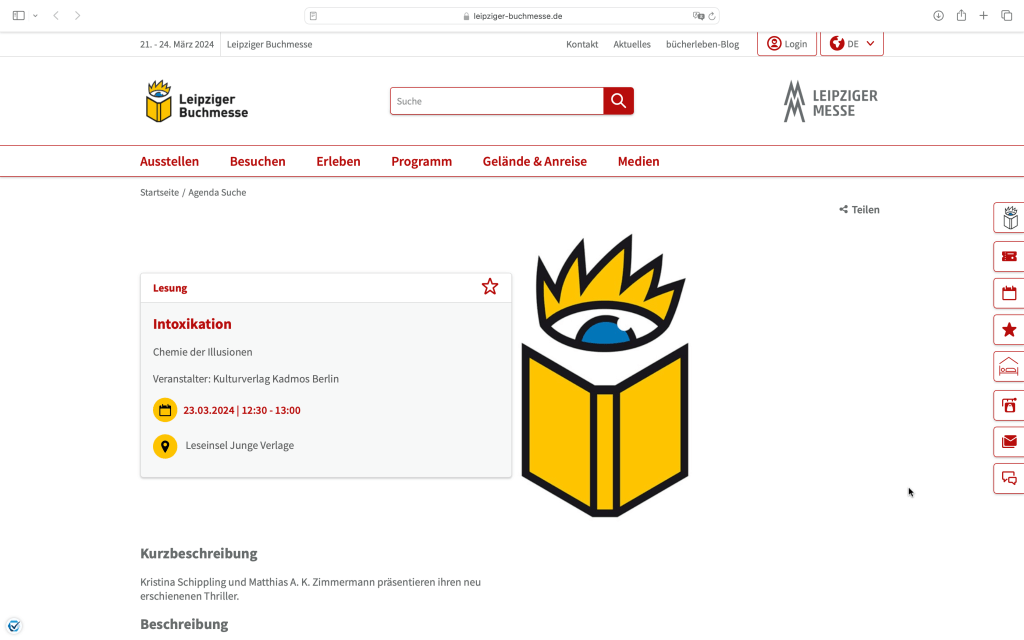 Es ist eine wirklich große Ehre auf der Buchmesse in Leipzig zu lesen. Zur Leipziger Buchmesse wird nun unser gemeinsamer Thriller „Intoxikation. Chemie der Illusionen“ erscheinen. Am 23.03.24, 12:30 Uhr lesen Matthias und ich auf der Leseinsel der Jungen Verlage aus unserem neuen Buch! Tausend Dank an den Kulturverlag Kadmos und Wolfram Burckhardt, an unsere Presseagentur Buch Contact und an die Leipziger Buchmesse! Wir freuen uns so sehr, unser Buch präsentieren zu dürfen.